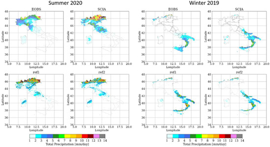 A first analysis was performed comparing the results of the simulations ref1 and ref2, characterized by the usage of shallow convection only and full convection, respectively. Figure 2 shows the distribution of daily precipitation averaged over the two periods considered (summer 2020 on the left and winter 2019 on the right), respectively, provided by E-OBS, SCIA, ref1 and ref2.
