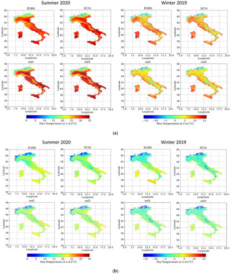 Distribution of daily maximum T2m (a) and minimum T2m (b) averaged over the two periods considered (summer 2020 on the left and winter 2019 on the right), respectively, provided by E-OBS, SCIA, ref1 and ref3.