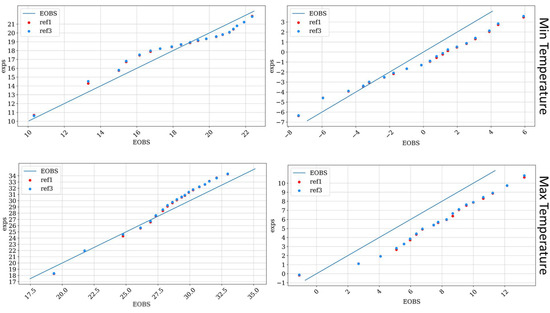 QQplot of daily maximum and minimum T2m (summer 2020 on the left and winter 2019 on the right): model data with ref1 and ref3 configurations against E-OBS data.