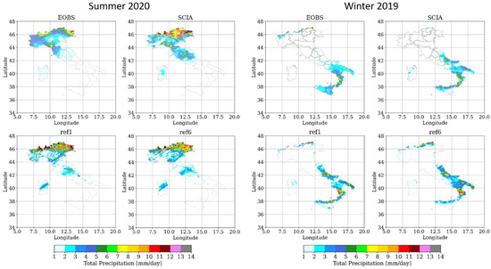 Distribution of daily precipitation averaged over the two periods considered (summer 2020 on the left and winter 2019 on the right), respectively, provided by E-OBS, SCIA, ref1 and ref6.