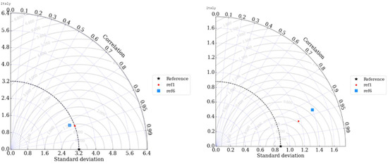 As already discussed, in summer 2020 ref1 underestimates the precipitation over the Alpine area whereas the almost null precipitation over southern Italy is well reproduced. As confirmed also by the numerical values of RMSE and MAE (Table 4), ref6 is not able to improve the model performances. In winter 2019, ref1 overestimates precipitation over southern-central Italy and also in this season ref6 is characterized by worse performances over the three areas. These findings are also confirmed by the Taylor diagrams (Figure 7), showing that ref1 performs better in both seasons also in terms of correlation and standard deviation.