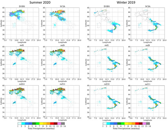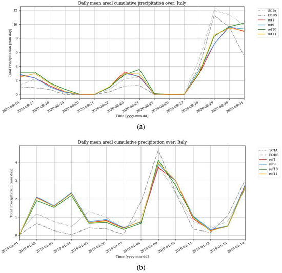 Over the other areas, no relevant differences among the configurations are recorded. In winter 2019, better performances are achieved with ref10, which allows a RMSE reduction in Central Italy from 0.5 to 0.4 and South Italy from 1.9 to 1.7. Figure 9 shows the time series of daily precipitation values (averaged over the whole domain) obtained with the different configurations and observational data, for summer 2020 (a) and winter 2019 (b).