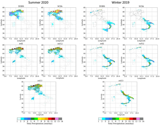 Distribution of the daily precipitation averaged over the two periods considered (summer 2020 on the left and winter 2019 on the right) provided by E-OBS, SCIA, ref1, ref12 and ref 13.