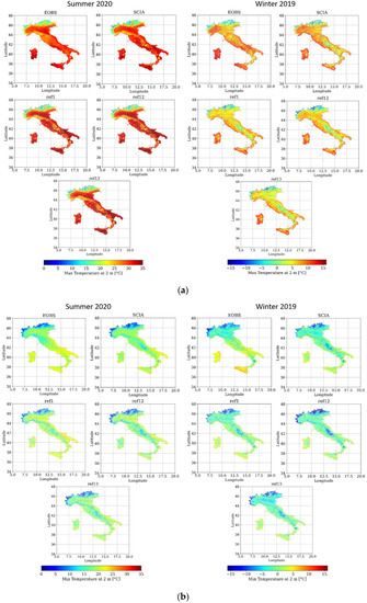 Distribution of the daily maximum T2m (a) and minimum T2m (b) averaged over the two periods considered (summer 2020 on the left and winter 2019 on the right), provided by E-OBS, SCIA, ref1, ref12 and ref 13.