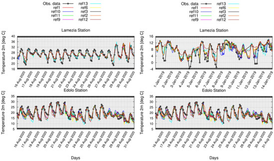 In order to endorse the results achieved, model evaluation was conducted also against data provided by stations scattered over the Italian area (Figure 12). These were chosen in order to test the model performances under different climate and orographic conditions. Figure 13 shows the time series of T2m for selected stations and periods obtained with the different configurations and observational data.