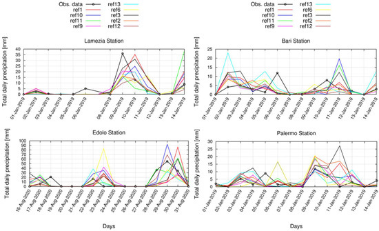 Time series of precipitation for selected stations and periods obtained with the different configurations and observational data.