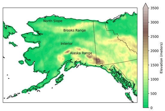 Alaska topography and geographic features. Elevation data from the National Center for Atmospheric Research (NCAR) TerrainBase, Global 5 Arc-minute Ocean Depth and Land Elevation from the U.S. National Geophysical Data Center (NGDC). https://rda.ucar.edu/datasets/ds759.2/ (accessed on 10 March 2022). The 5 Arc-minute data from NGDC have been coarsened to 25 km resolution for compatibility with the model simulations (Section 2).