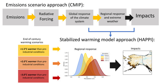 Schematic depiction (adapted from [21]) of a model-derived scenario of future climate (upper row of boxes) and the specific set of HAPPI simulations used to obtain the projections of Arctic change (lower left). Lower middle panel shows the distributions of Alaska precipitation in the HAPPI historical simulation (blue) and the three warming-scenario simulations (yellow, orange and brown for 1.5 °C, 2.0 °C and 3.0 °C global warming, respectively). Lower right panel is a mapping of changes over Alaska. Modified from D. Mitchell et al (2017, Geosci. Model Dev.), reprinted with permission under Creative Commons Attribution 4.0 License, https://creativecommons.org/, accessed on 25 February 2022.