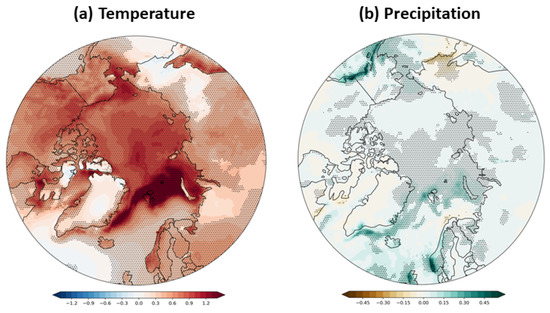 Temperature and precipitation are the key determinants of snowfall and snow on the ground; therefore, we begin with an examination of ongoing trends in temperature and precipitation in the Arctic based on the ERA5 reanalysis. Figure 3 shows the trends in these two variables for winter (December–February) over the full period of ERA5, 1950–2020. The well-documented Arctic warming [22,28] is apparent.