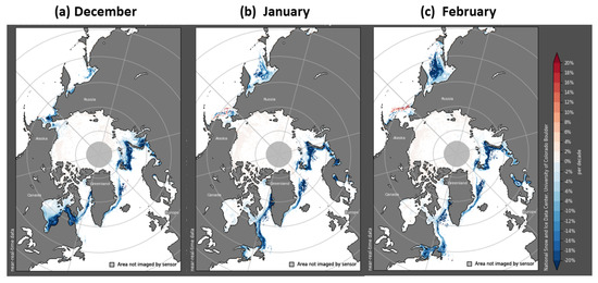 Trends sea ice concentration (fractional sea ice coverage) for (a) December 1979–2021, (b) January 1979–2022 and (c) February 1979–2022. Color bar on the right shows percentage changes from the start to end of the period (blue shades are decreases, red shades are increases). Source: National Snow and Ice Data Center dataset G02135, https://nsidc.org/data/seaice_index/compare_trends (accessed on 20 March 2022).