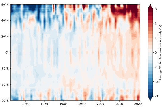 The warming in Figure 3a has also been far from uniform in time over the 1950–2020 period. Figure 5 is a Hovmöller diagram showing the change in temperature as a function of time and latitude. It is apparent from this figure that the Arctic was relatively cold in the 1950s and 1960s, somewhat warmer in the 1980s, cooler in the 1990s, and then substantially warmer in the period from about 2005 onwards. Consistent with the interpretation of the spatial pattern in Figure 3a, the warming of the post-2005 period coincides with the reduction in Arctic sea ice that became strikingly apparent with the rapid ice loss event of 2007 [30]. The Arctic amplification of the recent warming is strikingly apparent in Figure 5, as is the amplification of the cooling during the middle of the 20th century.