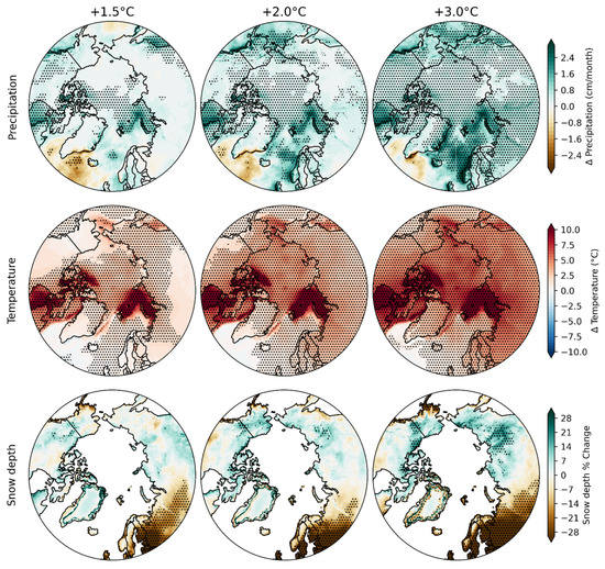 As described in Section 2, high-resolution simulations of the Arctic were available for three different scenarios of stabilized global warming: 1.5 °C, 2.0 °C and 3.0 °C. Figure 6 shows the projected pan-Arctic changes in temperature, precipitation and snowfall for the three stabilization levels.