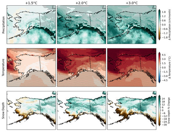 Perhaps the most striking feature of Figure 7 is the absence of statistically significant changes in all three variables under 1.5 °C global warming, in contrast to the widespread areas of statistically significant changes in Alaska’s precipitation and temperature when the global warming reaches 2.0 °C and 3.0 °C. Alaska is evidently delicately poised for far more significant climatic change if the Paris Agreement target of 1.5 °C global warming is met. This finding is especially true of temperature and precipitation, with the opposing effects of these variables on snowfall reducing the sensitivity of snowfall to the magnitude of the global temperature increase.