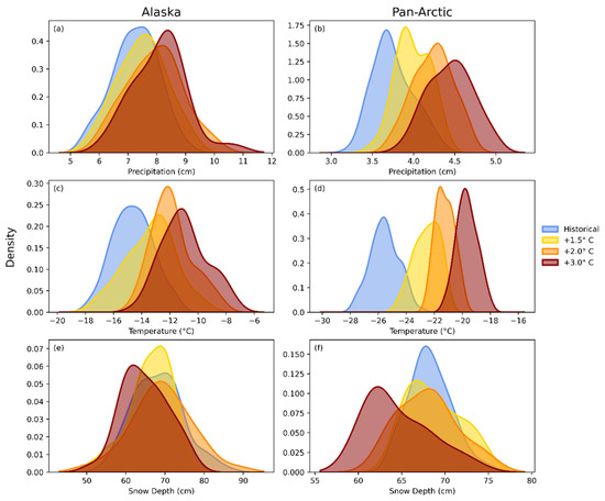 The projected changes can be viewed from a different perspective in Figure 8, which shows the probability density functions of historical and future winter precipitation, temperature and snow depth for Alaska and the pan-Arctic domains.