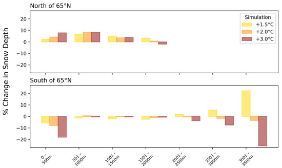 The preceding discussion, as well as the prominence of topographic influences in Figure 7 (bottom row), suggest the need for a closer look at the elevation dependence of the projected changes. In a previous study, [35] found that late-21st-century reductions in snowfall in Alaska under the RCP 8.5 scenario were greater (as percentages) at low elevations and smaller at high elevations. Here, we augment our results on snowfall with an examination of changes in the elevation dependence of winter snow depth. Snow depth is influenced by temperature, which varies with latitude as well as elevation in Alaska; therefore, we evaluated the elevation dependence of the change in snow depth separately for the northern and southern parts of Alaska. A dividing line of 65°N was chosen because it approximately bisects the state. For each region, the percentage change was calculated for each grid cell, and the percentage changes were then averaged over all grid cells in an elevation range.