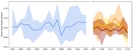 On the hemispheric scale, global climate models project continued decreases in snow extent and duration through the remainder of the 21st century [7,9,10,11,12,13]. The projected decrease has been shown to be linearly proportional to the increase in global mean temperature, and this temperature dependence overwhelms any emission pathway dependence [7]. However, the pathway dependence of the global mean temperature is such that the reduction in the Northern Hemisphere’s annual snow cover area by the late 21st century ranges from about 10% under the SSP1-2.6 scenario to about 30% under SSP58.5 [9]. These decreases are consistent with decreasing snow-to-rain ratios as the Arctic becomes warmer and total precipitation increases [10,11,12,13]. In [12], the entire region shows trends towards increased rain fractions in model simulations of the 21st-century climate. However, most of the diagnoses of changes in snow relative to changes in temperature and precipitation in [12] are for the central Arctic, i.e., the area poleward of 70°N. The latest generation of climate models (CMIP6, the Coupled Model Intercomparison Project, phase 6) shows an even more rapid snow-to-rain transition than previous model generations [11], although the overall mean climate sensitivity in the Alaska region has increased in CMIP6 because a subset of the CMIP6 models has strong climate sensitivities, and hence, large increases in temperature and precipitation [14].