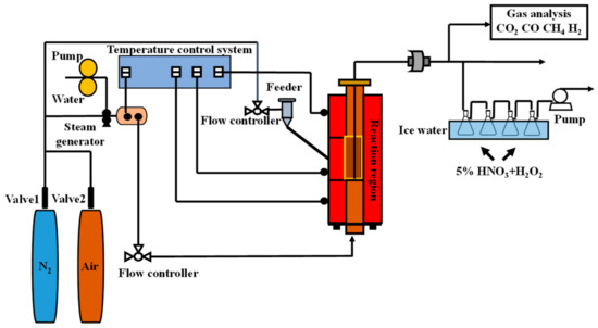 The experiments were conducted in a batch fluidized bed reactor. The equipment diagram was shown in Figure 1, the reaction system included a fluidized bed reactor, a flue gas analyzer and a steam generator. The tube was about 1000 mm and the inside diameter was 60 mm. Water steam was heated from the steam generator to 250 °C as the gasification agent after it had been produced by a controlled pump. The gasifying agent was carried by nitrogen into the reaction system from the bottom. Afterwards, the fuel gas was transported to the impingers that were prepared to absorb the gaseous selenium. A fuel gas analyzer was connected to detect the concentration of the coal gas products (CO, H2, CH4, N2, and CO2).