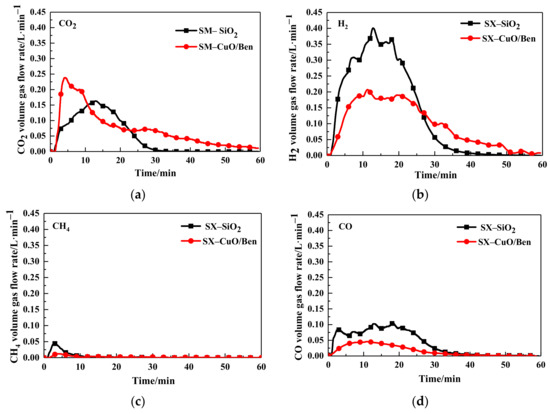 The results showed that the trend in flue gas concentration curve increased first and then decreased with the addition of the reaction time for either process between SX bituminous coal and CuO/Ben OCs, or between SX bituminous coal and quartz sand (SiO2), as shown in Figure 2a–d. The analyses of these charts showed that the concentration of CO2 in CuO/Ben OC was significantly higher than that of SiO2. The explanation was that CuO/Ben OCs reacted with syngas (CO, CH4, H2) to rapidly generate CO2 and H2O.