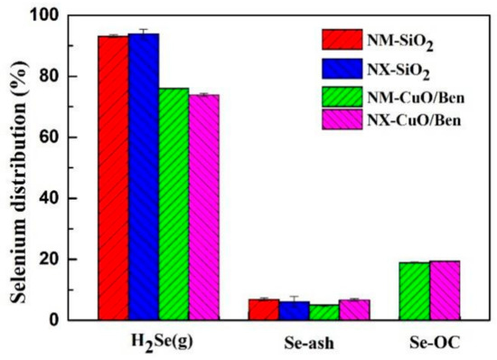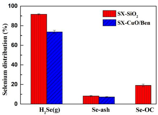 Primarily, the distribution of selenium during traditional gasification and the CLG of SX bituminous coal was investigated. As shown in Figure 3, in the conventional gasification of silica sand as the bed material, the distribution of selenium in the coal ash and gaseous phase accounted for 8.29% and 91.71%, respectively. The proportion of gaseous selenium was larger, and that of the bed material only occupied a small part. The conclusion was similar to previous results. The selenium content in fly ash was not considered, due to the small production of fly ash. Compared with the traditional gasification process, the process of CLG involves a large amount of metal oxides that can oxidize and adsorb selenium. Thus, a peculiar effect on the distribution of selenium may appear in this form of gasification. Figure 3 showed that the content of H2Se (g) decreased from 91.71% (with silica sand) to 73.65% (in CuO/Ben OC). Meanwhile, the content of selenium in OCs accounted for 19.07%, which showed that the addition of OCs could inhibit the volatilization of selenium in coal and a small amount of selenium migrated to OCs. Theoretically, the oxidation and adsorption of selenium by inorganic oxides in coal ash and unburned carbon were the main reasons to retain gaseous selenium. More selenium was successfully transformed into particulate selenium.