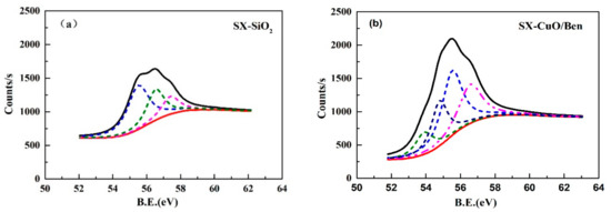 In order to analyze the existing form of selenium in the OCs, XPS (X-ray photoelectron spectroscopy) characterization was performed on the coal ash and OCs after traditional gasification and CLG. The internal reference for each spectrum was calibrated by the C1s binding energy (BE) at 284.80 eV. Three peaks at 55.5 eV, 56.5 eV and 57.4 eV could be observed in coal ash sample, as shown in Figure 4a. Based on the NIST X-ray photoelectron spectroscopy database, these three peaks overall represented elemental Se [37]. Because the binding energy of elemental selenium is complex, 55.5 eV, 56.5 eV, 57.4 eV and 54.7 eV represent elemental selenium in Figure 4. However, except for four peaks of elemental selenium, a peak at 53.9 eV was detected in the CuO/Ben OCs after CLG in Figure 4b, which corresponded to the compound Cu2Se [38]. This indicated that a small amount of selenium migrated to the OC in the form of Cu2Se during CLG as shown in Table 4.