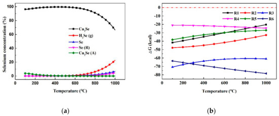 (a) The existing form of selenium in CLG; (b) Gibbs free energy with temperature for reactions ((R1)–(R6)).