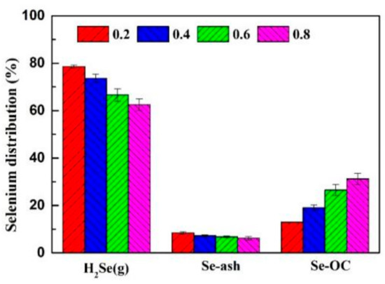 As the key to CLG, OC plays a critical role in influencing the distribution of selenium. The O/C ratio is a significant parameter affecting the CLG process. An O/C ratio that is too high will lead to raw materials being oxidized excessively, while an O/C ratio that is too low cannot achieve a good gasification effect. To explore the impact of the O/C ratio on the migration behavior of selenium, experiments were carried out when the O/C ratio was 0.2, 0.4, 0.6 and 0.8, under identical operation conditions. Figure 6 showed the impact of various O/C ratios on the distribution of selenium.