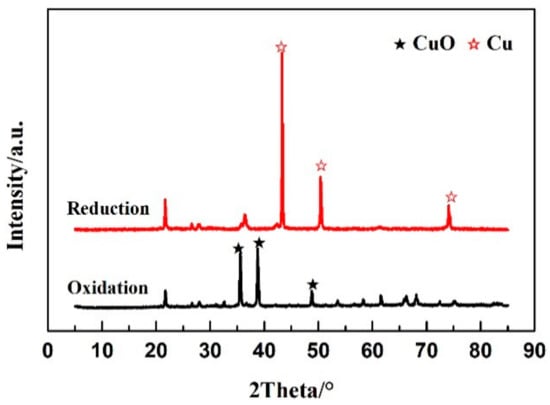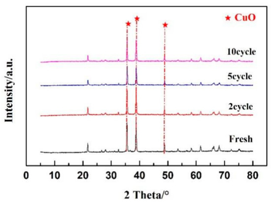 The recycling of OC is the guarantee for the industrialization of CLG. The surface structure of CuO/Ben OC facilitates the adsorption of selenium into their porous channels. Hence, it is necessary to understand the recycle regeneration performance of the OC particles. Figure 8 showed the crystal structure changes of CuO/Ben OC in the regeneration process. Through reduction reactions in the gasification reactor, the crystal phase structure of CuO/Ben OC appeared as Cu, and the reduced products were oxidized to CuO in the air atmosphere at 900 °C.
