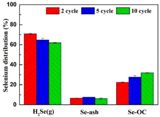 With the recycling period from two cycles to 10 cycles, the release rate of selenium decreased from 70.90% to 61.92%. The distribution of selenium remained basically stable in coal ash, however, the content of selenium in CuO/Ben OCs increased regularly, which demonstrated that the CuO/Ben OC had good recycling performance.