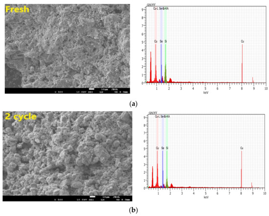 We aimed to thoroughly analyze the reasons why selenium was retained by the CuO/Ben OCs in CLG. As shown in Table 5 and Figure 11, some characterizations of SEM (Scanning electron microscopy), EDS, pore volumes and specific surface area analysis were conducted on the regenerated CuO/Ben OCs. Fresh CuO/Ben OC has more pores and a denser pore distribution.