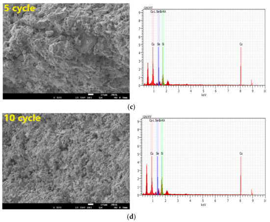 With the increase in the regeneration cycle, the porous channels of the CuO/Ben OC were enhanced, and there existed no sintering phenomenon at the same time, indicating that the OC has good cycle stability, as shown in Figure 11. In Figure 11 we can find that the retention of selenium by OC is relatively stable as the number of cycles increases. The retention effect of selenium by OC did not change as cycles increased. Selenium can still be detected in the 10th cyclic experiment as shown in Figure 11d. The data in Table 5 confirmed the SEM and EDS observation results. The specific surface area of fresh particles was 0.578 m2/g, and while five cycles were completed, the specific surface areas of CuO/Ben OC added up to 1.233 m2/g, with pore volumes increasing from 0.121 cm3/g to 0.143 cm3/g. Until the regeneration cycle was executed 10 times, the specific surface area of CuO/Ben OC further increased to 1.809 m2/g, and the pore volume increased to 0.168 cm3/g. Hence, with the increase in regeneration cycles, the capacity of CuO/Ben OCs to retain selenium was strengthened due to the increased surface pore structure.