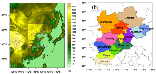 (a) Three nested domains for WRF-Chem model simulations with topography (in units of m); (b) map showing the cities in BTH region with CTGC and CTEC implemented.