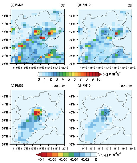 The spatial distribution of (a,c) PM2.5 and (b,d) PM10 emission intensity (units: μg/m2s) in the inner domain for (a,b) the baseline simulation and (c,d) the mitigated counterparts (units: μg/m2s) due to the implementation of CTGC and CTEC projects from 2016 to 2018.
