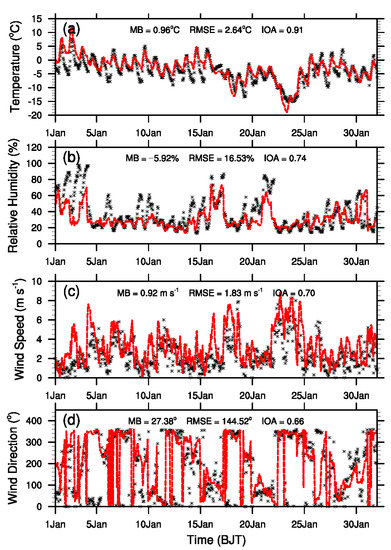 To evaluate the model’s performance in simulating air quality in the BTH region, the near-surface meteorological observations, including 2 m temperature (T2), 2 m relative humidity (RH2), and 10 m wind speed (WS10), were obtained from the National Meteorological Information Centre (NMIC), respectively; the time periods of 1 January 2016 (2019) to 1 February 2016 (2019) were used. Accordingly, hourly concentrations of six air pollutants (i.e., PM2.5, PM10, SO2, NO2, CO, and O3), were acquired from the China National Environmental Monitoring Centre (CNEMC). In the present study, three statistical indices [30], i.e., index of agreement (IOA), root mean square error (RMSE), and mean bias (MB), were calculated to compare the modeled meteorological conditions with observational counterparts (see Equations as follows):