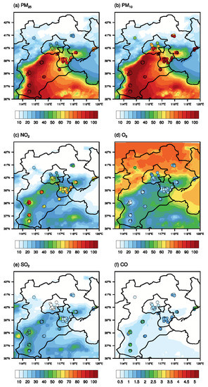 The spatial distribution of simulated (shading) and observed (dots) concentrations for (a) PM2.5, (b) PM10, (c) NO2 (d) O3 (e) SO2 and (f) CO averaged in January 2016 (in units of μg/m3, except mg/m3 for CO).