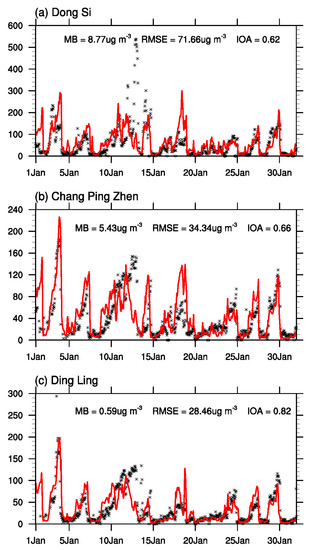 The simulated (red curve) and observed (black curve) temporal evolution of PM2.5 concentrations (units: μg/m3) over (a) urban, (b) suburban, and (c) rural stations.