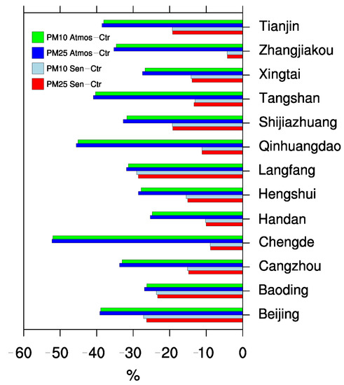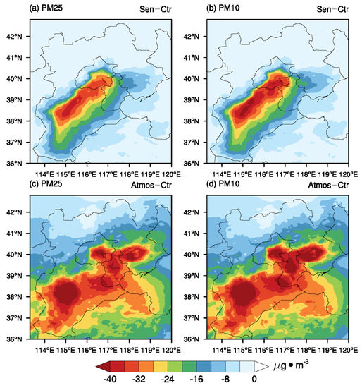 Figure 6c,d describe the changes of PM2.5 and PM10 mass concentration due to the meteorological background changes (Sen_2019–Base). Again, meteorological conditions in the Sen_2019 case correspond to the year 2019, but with identical anthropogenic emissions as the Sen_coal case. It was found that the concentrations of PM2.5 and PM10 during 2016 were higher than their counterparts in 2019. Thus, meteorological conditions in 2019 were less conducive to poor air quality than in 2016. It was also noticed that some cities (e.g., Beijing, Tangshan, and Qinhuangdao) were more affected by the change of meteorological conditions which indicates that the effects of meteorological condition changes are not spatially uniform in the BTH region. In particular, the meteorological conditions are uncontrollable but predictable. Thus, it is necessary to take meteorological conditions into account when formulating air-quality-related governmental supervision and control measures.
