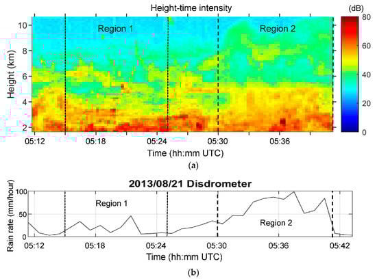 Figure 14b increased from about −1.5 to around zero between 05:18 and 05:42 UTC and decreased quickly after 05:42 UTC, although the PD fluctuated during this time interval. Fluctuation of PD could be due to changes of axis ration and DSD of raindrops during updraft motion. According to previous research, the axis ratio and DSD of raindrops might be influenced by rain rates and winds [