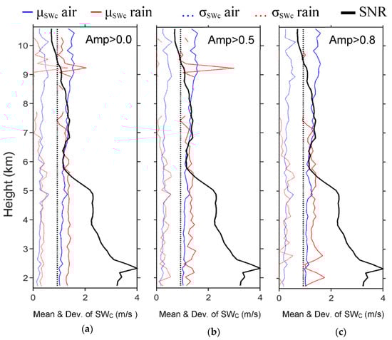 Figure 6a, where the radar echoes were much larger than 10 dB. Even if the outcomes having the amplitudes larger than 0.5 or 0.8 (a normalized amplitude from the Gaussian fitting) were adopted, the mean SW