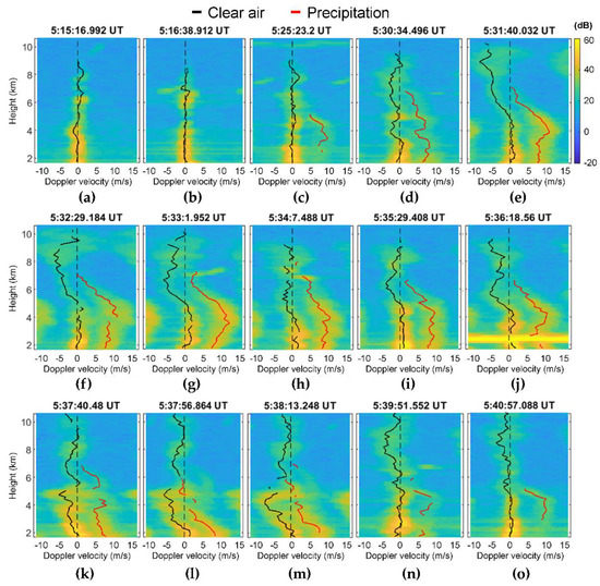 Figure 12l,m. As seen, the Doppler profiles of clear air broke around the height of 5 km and continued again since ~6 km. The echoes in the height interval of 5 and 6 km were traced as precipitation, and the weak precipitation echoes between 5 and 7 km and around 5 m/s, which were traced successfully in the panel