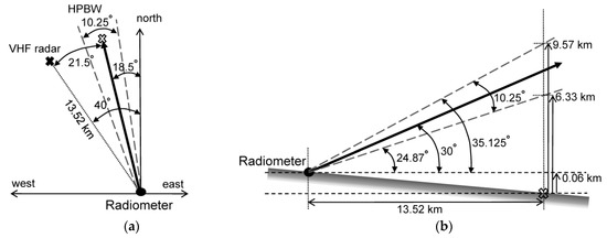 Figure 13 depicts the configuration of experimental setup. The VHF radar beam was transmitted vertically, and the antenna beam of the radiometer was steered to the northwest direction at an elevation and azimuth angles of 30° and 341.5°, respectively. Therefore, the observation zone of the radiometer at the distance of 13.52 km lay about 5 km to the east of the VHF radar site, and approximately in the height range between 6.33 and 9.57 km above the sea level of the VHF radar site. As a result, there was no overlapped field of view between the obliquely pointed radiometer beam and the vertically pointed VHF radar beam. Nevertheless, by taking account of finite beam widths, the separation of observational volumes between the radiometer and the VHF radar was less than 5 km in the height range of 6.33 and 9.57 km. A separation of 5 km was not a considerable distance for the convective structure examined later that covered a horizontal region of over ten kilometres. Therefore, it was justified to compare the concurrent measurements of convective precipitation aloft made by the VHF radar and the radiometer.