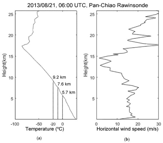 According to the rawinsonde measurement at 06:00 UTC, conducted by the Pan-Chiao radiosonde station that was located at about 25 km east-northeast of the VHF radar, the temperatures of 0 °C, −10 °C and −20 °C appeared at the heights of around 5.7 km, 7.6 km and 9.2 km, respectively, as shown in
