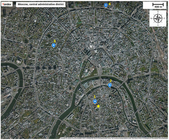 Moscow is the largest metropolis in Europe (area > 2.5 million km2, population > 12.5 million people), located in the central part of the European Territory of Russia (ETR). It is characterized by all the specific features inherent in the largest cities in Europe. The development of urban infrastructure has trends similar to the development trends of large modern cities. The administrative, business and shopping centers are concentrated in the central part of the city. The main anthropogenic sources of air pollution in the central district of Moscow are transport, thermal power plants, food industry and household services. Enterprises of various industries are located in industrial areas at a distance from the center [69,70,71,72].