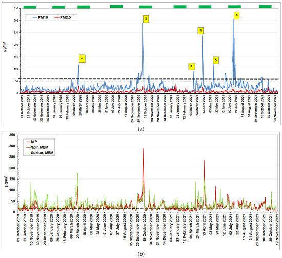 Average daily values of PM10 and PM2.5 particles mass concentration in near-surface air in Moscow during two years of continuous monitoring: (a) (upper figure)-selection of episodes for analysis (yellow squares 1–6), green segments at the top–periods of intensive monitoring with determination of aerosol elemental composition; (b) (lower figure)-comparison with the results of monitoring at the MEM stations (Spiridonovka and Sukharevskaya). Dashed lines are the daily MPC value for PM10 particles in the air of residential areas.