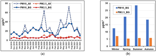 Intra-annual changes in the average (All) and background (BG) values of the aerosol concentration of PM10 and PM2.5: (a) by month; (b) by season (on average for two years of observations).