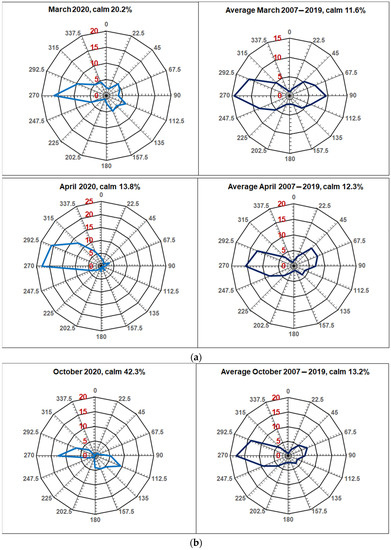 The wind speed in the atmosphere near the surface in the center of Moscow rarely exceeds 3 m/s in single measurements. The average daily value of wind speed is usually 1–2 m/s. Comparing the percentage of calm in certain months of 2020 and 2021 with the long-term average ones (Figure 4), we can suppose that the probability of calm conditions in the center of Moscow has increased in recent years.