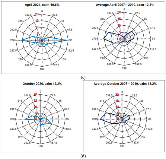 Figure 4 shows wind roses calculated for months with episodes of extreme aerosol pollution in comparison with long-term (2007–2019) average ones. The top four diagrams (Figure 4a) refer to episode 1, then two down-episodes 2 (Figure 4b), 4 (Figure 4c) and 6 (Figure 4d). All episodes of high aerosol concentration in near-surface air of Moscow occurred in months with wind roses differed from the long-term average one, with the exception of episode 6, when air pollution depended on a close local anthropogenic source, and not on meteorological conditions. It is also interesting to note that in the months with increased air pollution, the percentage of calm conditions was higher than the long-term average one, especially in October 2020.