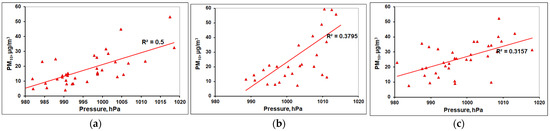 The dependence of the PM10 aerosol concentration on the air pressure in the surface atmosphere in Moscow during periods of intensive observations through the days outside the episodes of maximum air pollution (Table 2): (a) spring 2020; (b) autumn 2020; (c) spring 2021. R2—the reliability coefficient of the linear relationship (straight lines) between variables.