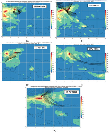 Examples of BC distributions (as an indicator of fire emissions) in near-surface atmosphere over ETR territory (according to MERRA-2 reanalysis [81]) and trajectories of air mass transport (black dots) to Moscow (asterisk) for individual days from episodes No. 1 (a,b), No. 4 (c–e). The color scales of BC concentration on the maps are different, kg/m3.