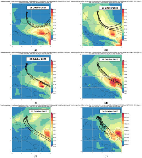 The development of the episode No. 2 (5–15 October 2020): examples of dust propagation (as an indicator of dust storm emissions) over the territory of the southern half of ETR (according to MERRA-2 reanalysis [81]) and air mass transport trajectories (black dots) to Moscow (asterisk) for individual daysfrom 6 to 14 October 2020 (the dates are shown in the pictures). The color scales of dust concentration on the maps are different, kg/m3.