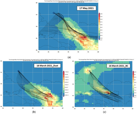Long-range air mass transport to the Moscow region on 17 May 2021 (a) or 16 March 2021 (b,c). Distributions of dust (a,b) or BC (c) in near-surface atmosphere on the maps correspond to the MERRA-2 reanalysis data [81]. The color scales of BC and dust concentrations on the maps are different, kg/m3.